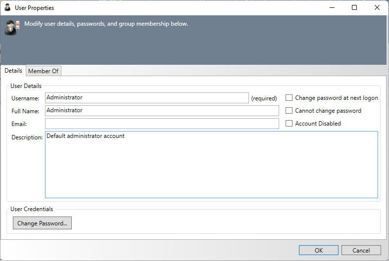 The Users tab on the Administrative Tools window lists all of the users defined in the GENESYS repository that the user logged into. For each user, the User Name, Description (if any), Full Name, Email Address, and whether the user has been associated with a Windows account are also listed.