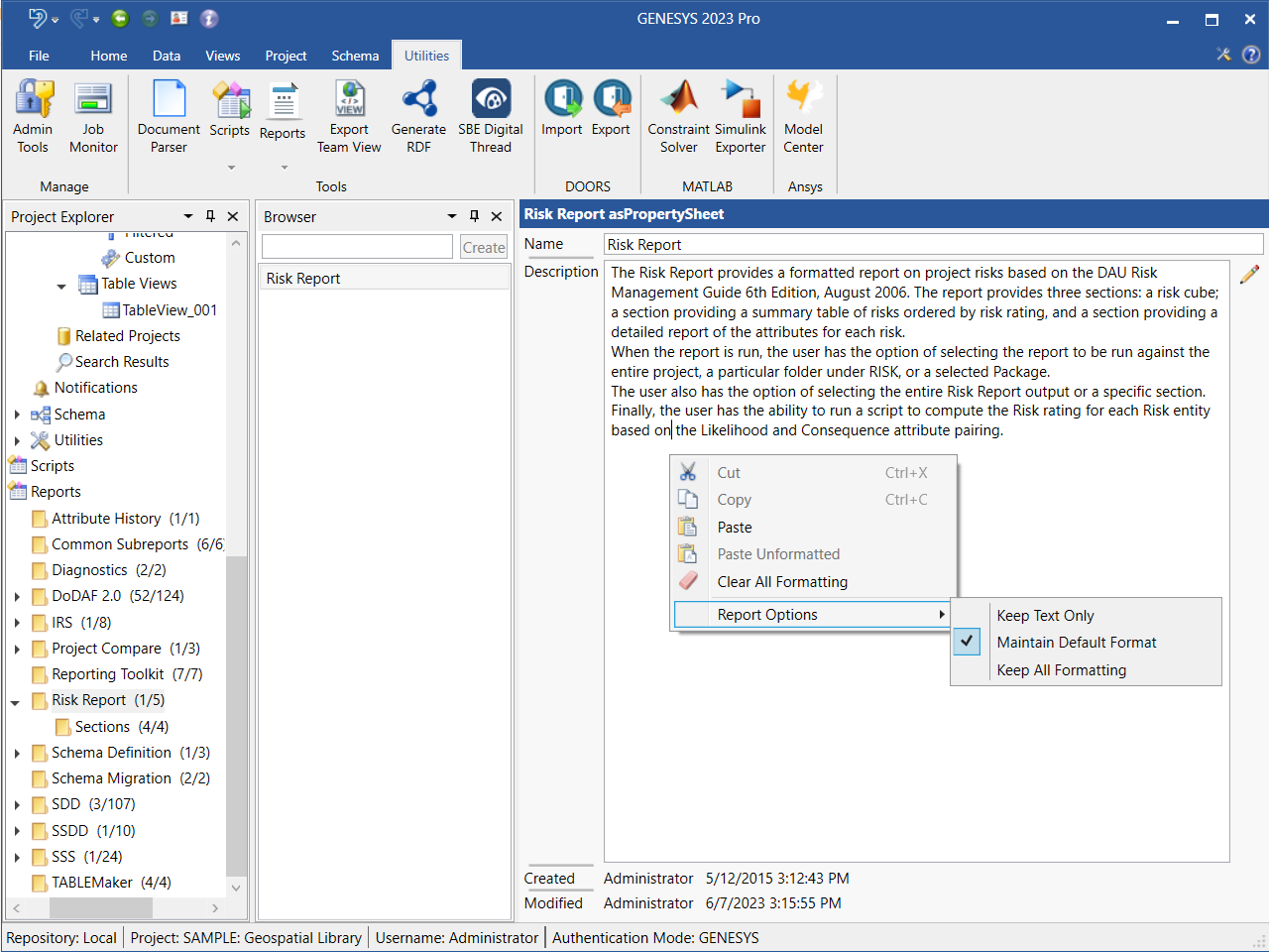 The Report Options feature, accessed on the right-click context menu from the report property sheet, controls how a text attribute value is output in reports. The text can be output with all formatting intact, keep the formatting except the font family and font size and make it match the report settings, or output just the text and removing all formatting from the value.