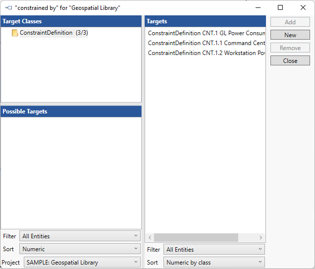The Edit Constraint Definition command allows you to edit the constraint for a Component (first image) or the children of the selected constraint definition (second image). The command opens a target window on the includes or constrained by constraint definition relation from which you can add or remove entities as desired.