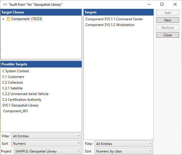 The Edit Parts or Parts command allows you to specify the child component for the selected component. The command opens a target window on the built from relation from which you can add or remove components as desired.
