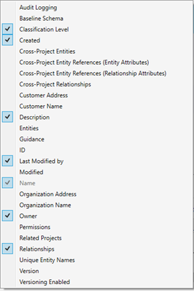 from the context menu.A context menu will then appear prompting the user to name the Project, select which Project Folder it should be created in, and which Base Schema to use. Options to select “Unique Entity Names,” “Versioning,” and “Audit Logging” are also available.